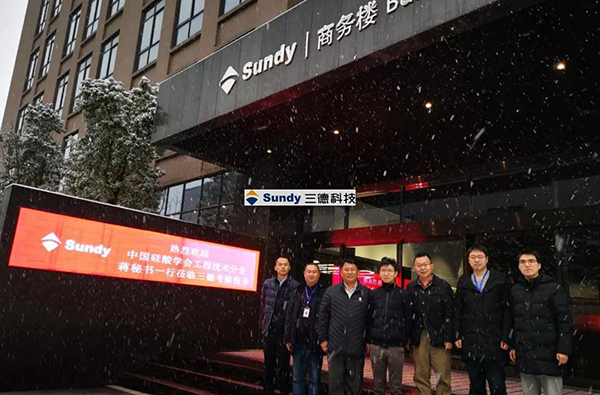 1月16日,大雪紛飛的長沙,中國硅酸鹽學會工程技術分會執(zhí)行秘書長蔣永富、技術研發(fā)部部長陳曉東、執(zhí)行秘書徐榮蒞臨三德科技(股票代碼300515)調(diào)研、考察,三德環(huán)保(三德科技控股子公司,分會戰(zhàn)略合作伙伴)董事長朱青、三德科技銷售部經(jīng)理劉向輝等陪同接待。
